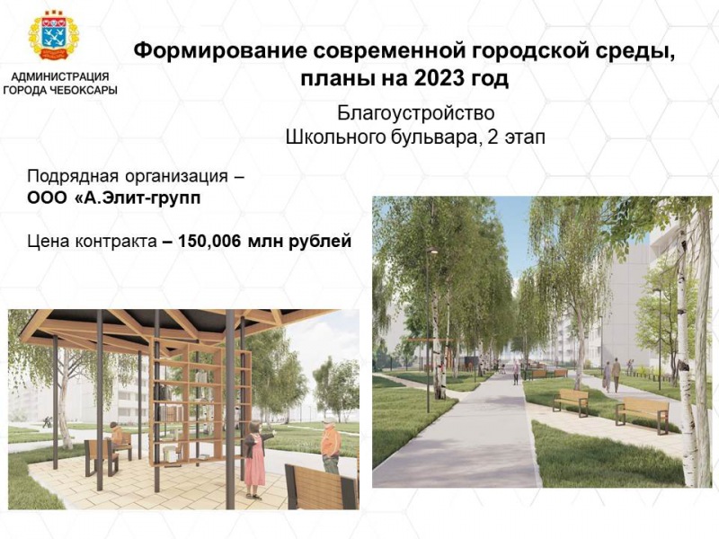 На Школьном бульваре подрядчику ООО "А.Элит-групп" (г. Казань) предстоит выполнить обустройство сети тротуаров и проездов, завершить устройство системы водоотведения, установить детские и спортивные площадки, скамейки и урны, обустроить освещение и системы видеонаблюдения, выполнить озеленение.