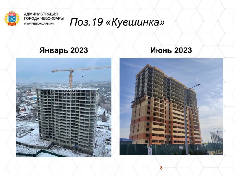 ООО "СЗ "Лидер" ("Кувшинка" поз. 19), степень готовности - 51%. В настоящее время производится каменная кладка наружных и внутренних стен и перегородок, производится монтаж стояков ливневой канализации, жилье ожидают 253 гражданина, ввод в эксплуатацию планируется в конце 2023 года.