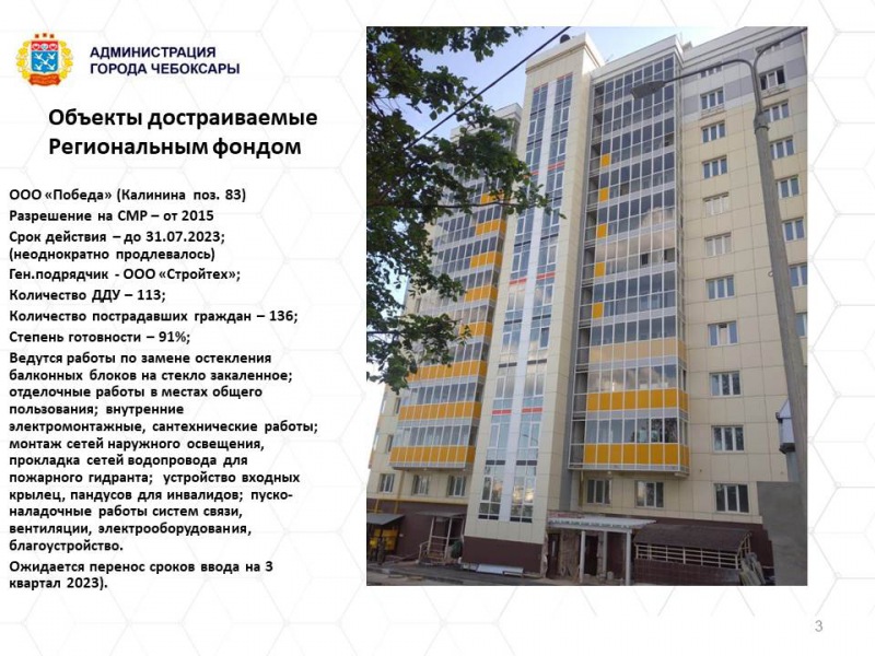 Региональный фонд достраивает объекты ООО "Победа" (Калинина поз. 83), где генподрядчиком выступает ООО "Стройтех", а степень готовности объекта составляет 91%. Свое жилье ожидают 136 граждан, ожидаемый срок ввода жилья в эксплуатацию - 3 квартал 2023 г.