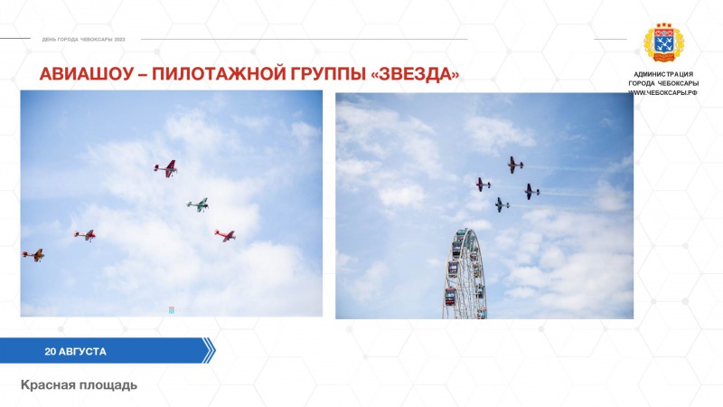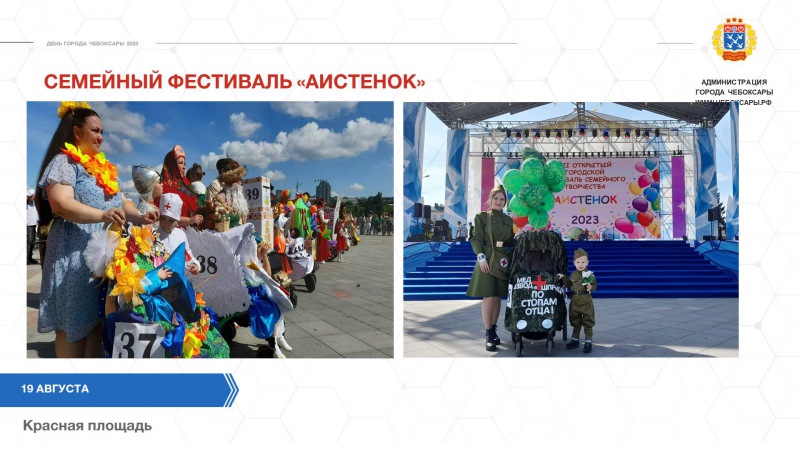 Марафон событий, приуроченных к празднованию 554-го дня рождения Чебоксар стартовал в середине июля, всего проведено более 250 тематических акций, фестивалей, конкурсов, спортивных и культурных мероприятий, посвященных Дню города, в них принял участие каждый второй горожанин.