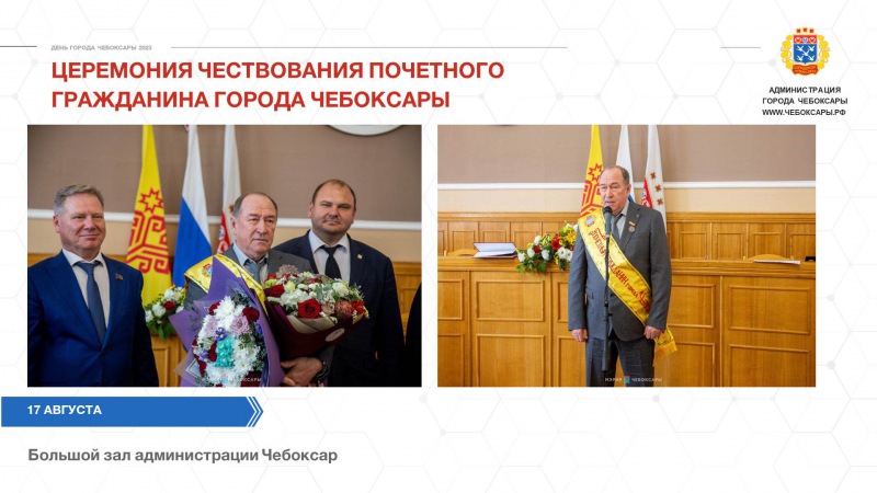 17 августа в большом зале администрации города Чебоксары состоялась церемония чествования Почетного гражданина и вручение правительственных и муниципальных наград.
