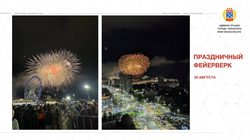 Кульминацией Дня города стал праздничный фейерверк в 22 часа. 20 августа был дан официальный старт 555-летнего юбилея Чебоксар.