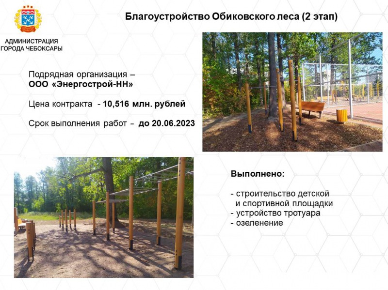 1. Благоустройство Обиковского леса (2 этап) - 10,516 млн рублей. Подрядчик - ООО "Энергострой-НН". Выполнено устройство детской и спортивной площадки и тротуара, озеленение. Ведется приемка документов и устранение замечаний.