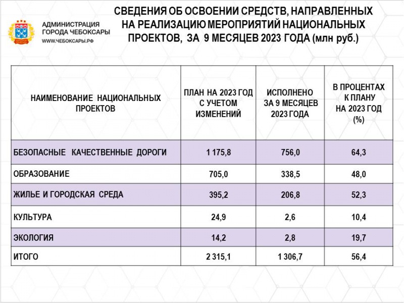 В бюджете города Чебоксары на 2023 год на реализацию 5 национальных проектов ("Безопасные качественные дороги", "Образование", "Жилье и городская среда", "Культура", "Экология") предусмотрены средства в общей сумме 2 млрд 315,1 млн рублей, исполнение за 9 месяцев текущего года составило 1 млрд 306,7 млн рублей или 56,4 % от плана на год.