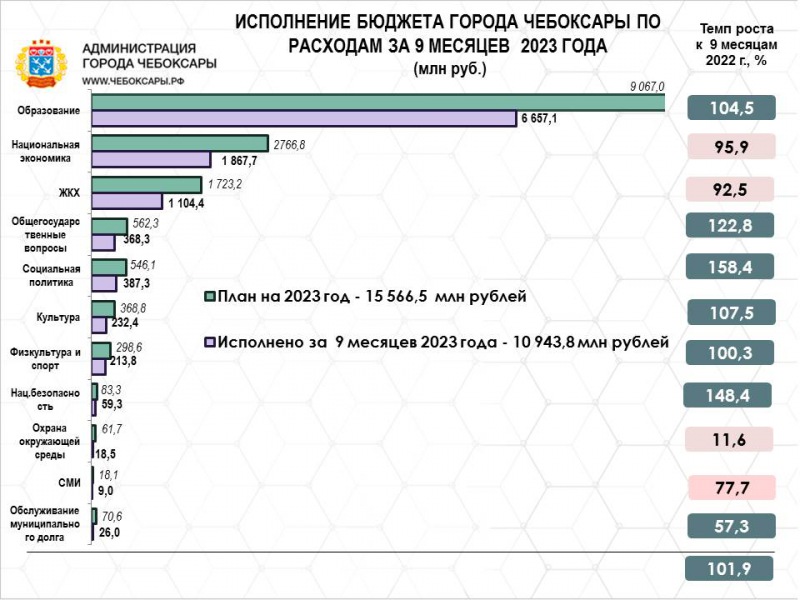Бюджет города Чебоксары по расходам за 9 месяцев 2023 года исполнен в сумме 10 млрд 943,8 млн рублей, что составляет 70,3 % к уточненным годовым назначениям.