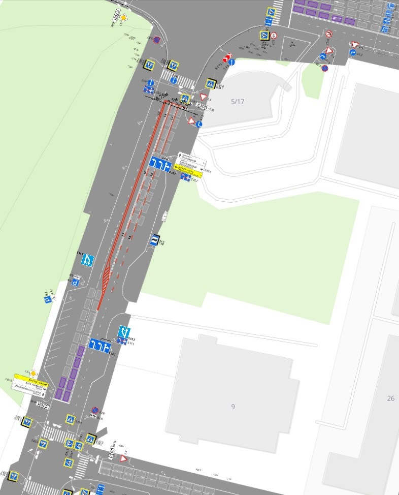 Предполагается в существующих границах дороги организовать 3-х полосное движение путем изменения разметки и организовать дополнительную полосу перед перекрестком за счет изменения ширины полос движения. Поскольку интенсивность левоповоротного направления составляет 75% от общего количества потока, предлагается с двух крайних левых полос разрешить поворот налево, а с крайней правой полосы осуществлять движение прямо и направо.