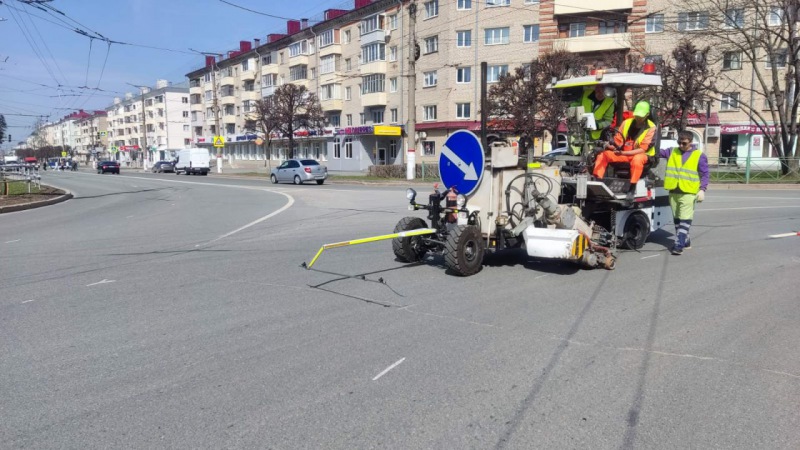 На проезжей части центральных дорог идет нанесение разметки - разделительных осевых и пешеходных переходов. Работы производятся как устойчивым термопластиком, так и краской.