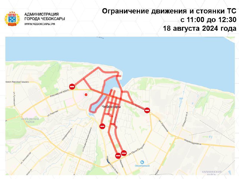 С 11 час. 00 мин. до 12 час. 30 мин. 18 августа ограничить движение транспортных средств (за исключением общественного транспорта) по проспекту Ленина (от пересечения с улицей Гагарина до улицы Карла Маркса), по улицам Карла Маркса, Дзержинского (от пересечения с улицей Ярославской до пересечения с Президентским бульваром), Ленинградская, Композиторов Воробьевых, Константина Иванова, Водопроводной, Калинина (от пересечения с улицей Гагарина до улицы Композиторов Воробьевых), Сергия Радонежского, Ярославская, Энгельса (от пересечения с улицей Гагарина до улицы Ярославской), Московскому проспекту (от Московского моста до пересечения с улицей Водопроводной), Президентскому бульвару (от пересечения с 30 автодорогой до пересечения с площадью Красной), дамбе Чебоксарского залива города Чебоксары;