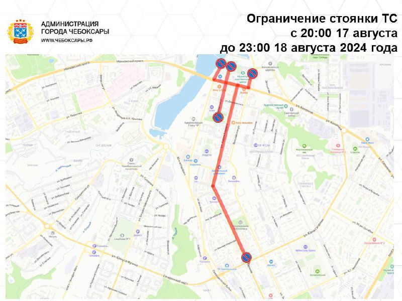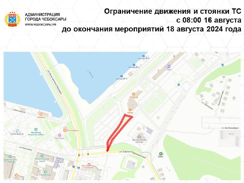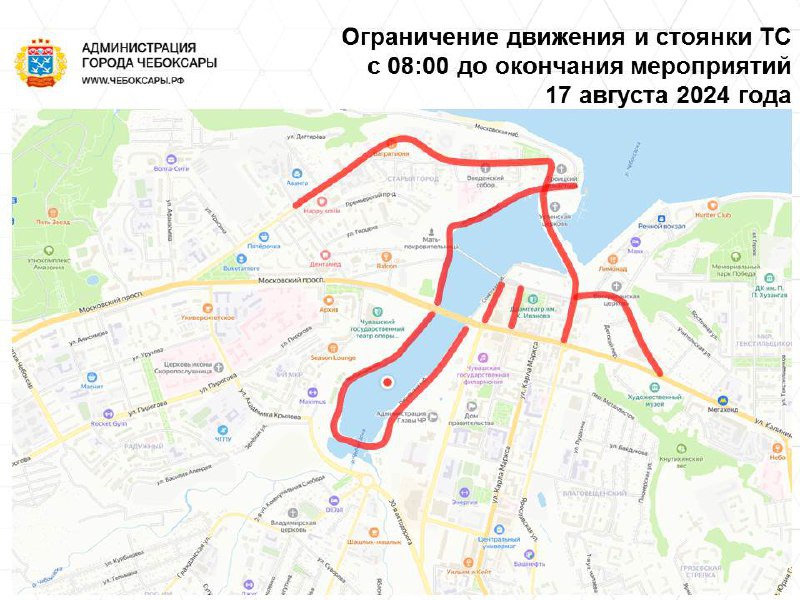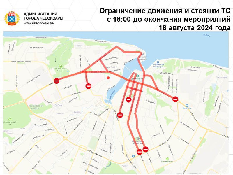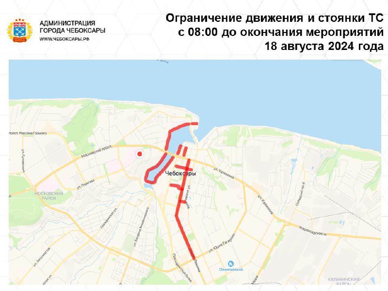 С 7 час. 00 мин. 16 августа (пятница) до окончания мероприятий 18 августа (воскресенье) ограничивается движение и стоянка транспортных средств по улице Ленинградская (от пересечения с улицей Композиторов Воробьевых), Президентскому бульвару (от пересечения с улицей Композиторов Воробьевых), Советской набережной Чебоксарского залива, Пионерской набережной Чебоксарского залива, Театральной набережной Чебоксарского залива, Исторической набережной Чебоксарского залива, на участке дороги по Московской набережной (в районе дома № 1Б по улице Константина Иванова).