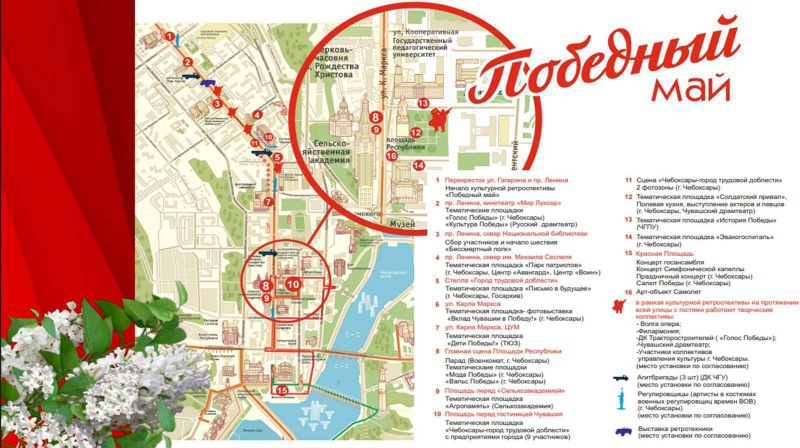 В Чебоксарах 9 мая впервые состоится масштабный проект Городская ретроспектива «Победный май». Центральная часть города от перекрестка улицы Гагарина и проспекта Ленина до бульвара купца Ефремова погрузится в атмосферу весны 1945 года: транспаранты из кумача, красные знамена Победы, ретро-плакаты, ретро-техника. На протяжении более двух километров, чебоксарцев будут встречать актеры, в образе жителей года 45-го года, которые представят сценические зарисовки возвращения к мирной жизни, посиделок горожан, встреч боевых друзей.