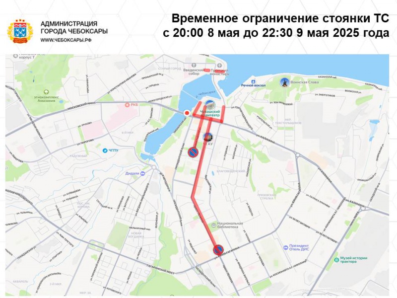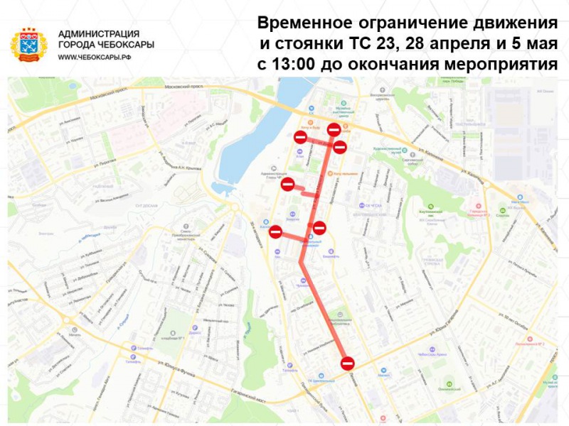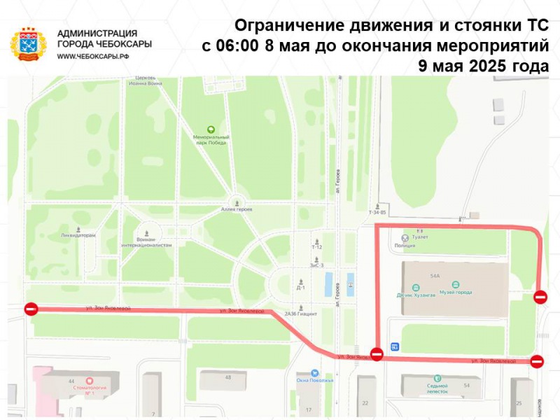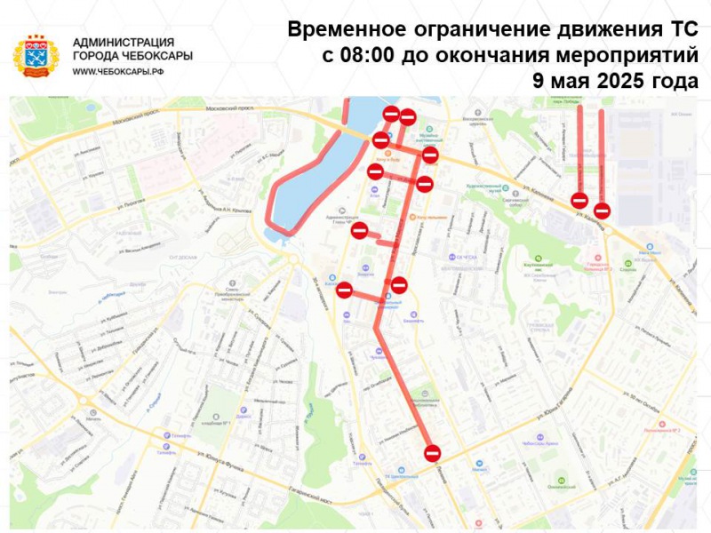 С 08 час. 00 мин. до окончания мероприятий 9 мая т.г. ограничиваются стоянка и движение транспортных средств на улицах Карла Маркса, Композиторов Воробьевых (от пересечения с Президентским бульваром до пересечения с улицей Ярославская), Логинова, Кооперативная, Дзержинского (от пересечения с Президентским бульваром до пересечения с улицей Ярославская), Ленинградская (от пересечения с улицей Композиторов Воробьевых до пересечения с площадью Красной), Текстильщиков, Ивана Франко, проспекте Ленина (от пресечения с улицей Гагарина до пересечения с Деловым проездом); бульварах Электроаппаратчиков, Президентском (от пересечения с 30 автодорогой до пересечения с площадью Красной), местном проезде между домами 6 на улице Кооперативная и 41 на улице Карла Маркса, Советской, Пионерской, Театральной и Исторических набережных Чебоксарского залива.