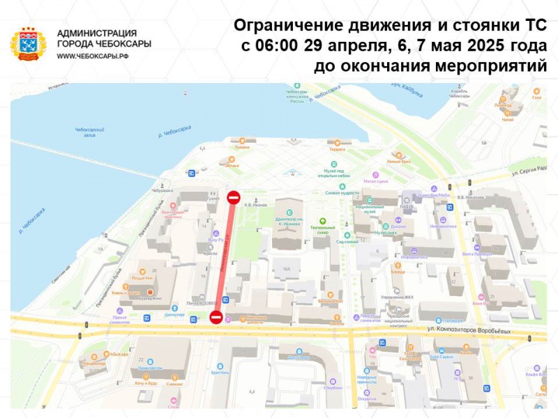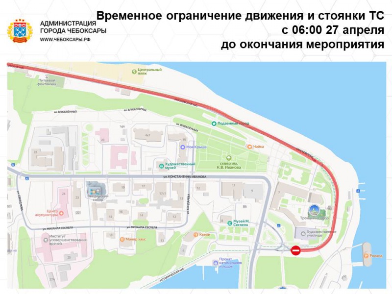 С 06 час. 00 мин. до окончания мероприятий 26 апреля (суббота) ограничивается стоянка и движение транспортных средств на Московской набережной Чебоксарского залива и в районе дома 8 на улице Михаила Сеспеля.