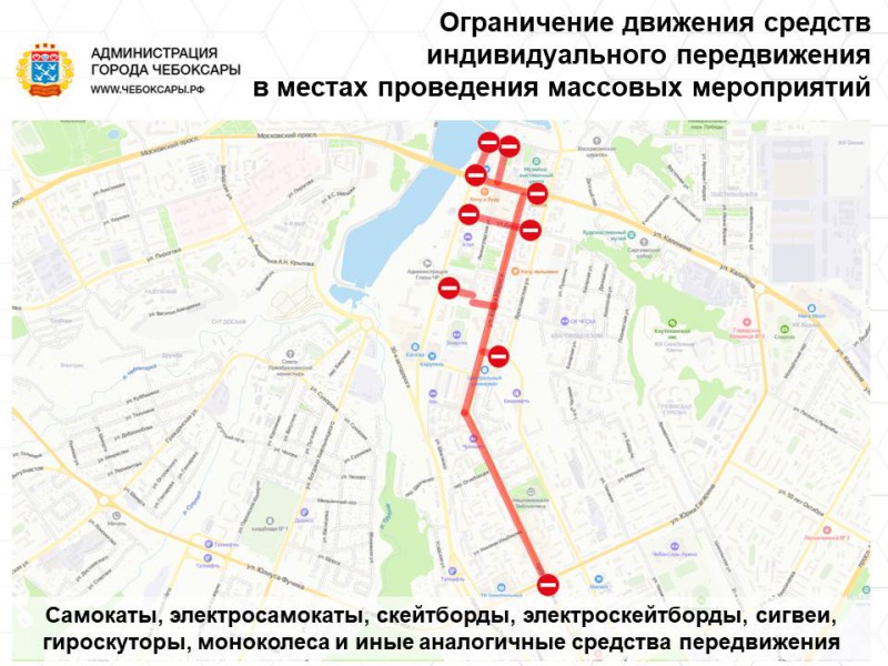 Уважаемые чебоксарцы, обращаем внимание: во время массовых мероприятий в центральной части города и в районе мемориального комплекса «Победа» ограничивается движение и стоянка велосипедов, самокатов, скейтбордов, средств индивидуальной мобильности: электросамокатов, электроскейтбордов, сигвеев, гироскутеров, моноколес и иных аналогичных средств передвижения.