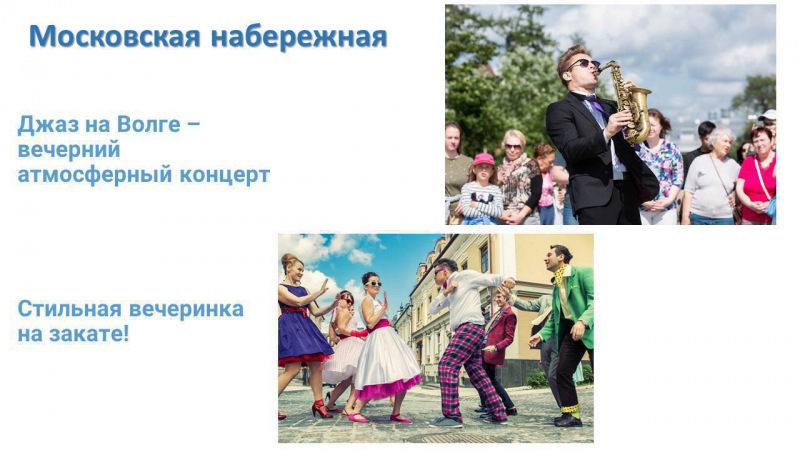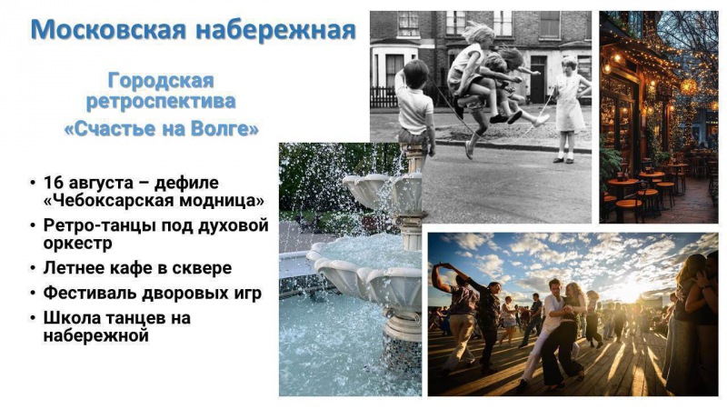 Впервые на Московской набережной пройдет ретроспектива 60-70-х годов.Здесь будет воссоздана атмосфера тех лет: фонтан, как на старых фото, модное дефиле, ностальгические мелодии, которые так любят горожане; фестиваль «Джаз на Волге».