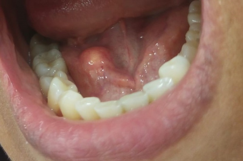 – При пальпации выявлен слюнный камень. Поставлен диагноз: обструкция (закупорка) протока поднижнечелюстной слюнной железы слюнным камнем.