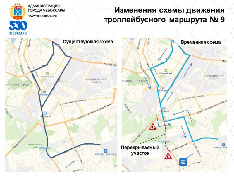 Движение троллейбусов по маршруту №9 "Аэропорт - Агрегатный завод" будет организовано по улице Ашмарина, бульвару Эгерский, проспекту 9 Пятилетки, проспекту И.Я. Яковлева, проспекту Мира, улице Калинина, улице Ю.Гагарина, проспекту Ленина, проспекту И.Я. Яковлева, проспекту 9 Пятилетки, бульвару Эгерский, улице Ашмарина.