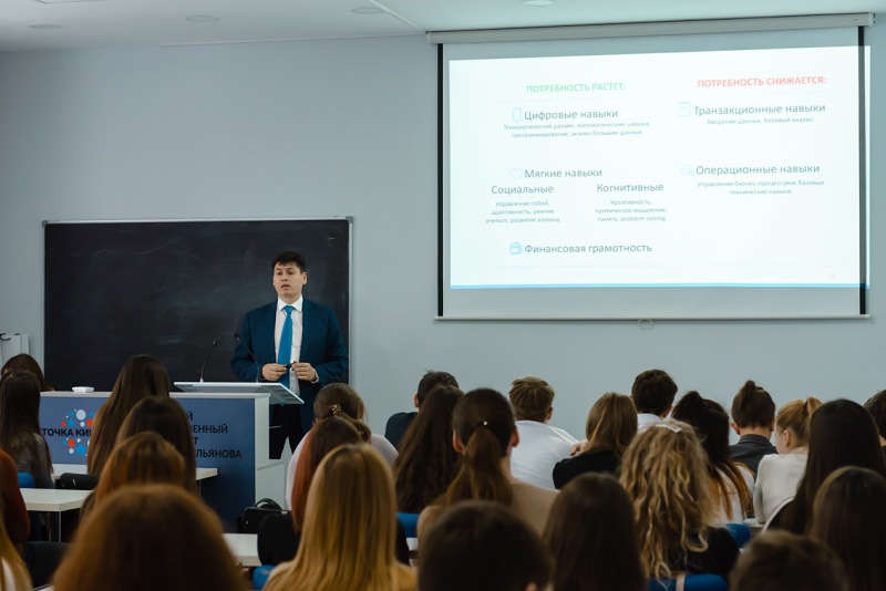 Сергей Анисимов раскрыл эти тезисы в своей лекции. Он рассказал о наиболее востребованных специальностях в ближайшем будущем, а также о навыках – тех, которые все больше теряют актуальность и, напротив, становятся все более востребованными – это цифровые навыки и, так называемые, «soft skills» – эмпатия, умение убеждать, находить подход к людям, лидировать, - они позволяют стать более успешными независимо от специфики деятельности и направления работы. Также Сергей Анисимов рассказал студентам об основах финансовой грамотности, личном финансовом планировании, современных инструментах на рынке, о способах получения не только текущих доходов, но и формирования капитала для будущего.