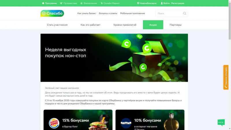 Программа лояльности 'СберСпасибо' празднует день рождения и дарит подаркиСамой крупной банковской программе лояльности в России исполняется 9 лет. В честь дня рождения «СберСпасибо» объявляет о неделе выгодных покупок для своих клиентов: с 9 по 15 ноября 2020 года при совершении покупок по карте СберБанка у партнёров акции участники получат повышенные бонусы и подарки.