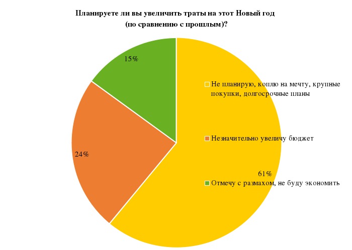 В ходе исследования россияне сообщили, что в настоящий момент копят деньги на исполнение заветной мечты и крупные покупки – так ответили подавляющее большинство респондентов (61%). Данная категория не планирует увеличивать траты на этот Новый год по сравнению с прошлым. 24% позволят незначительно увеличить свой новогодний бюджет. Отметить «с размахом» и не экономить на празднике и подарках намерены 15% опрошенных.
