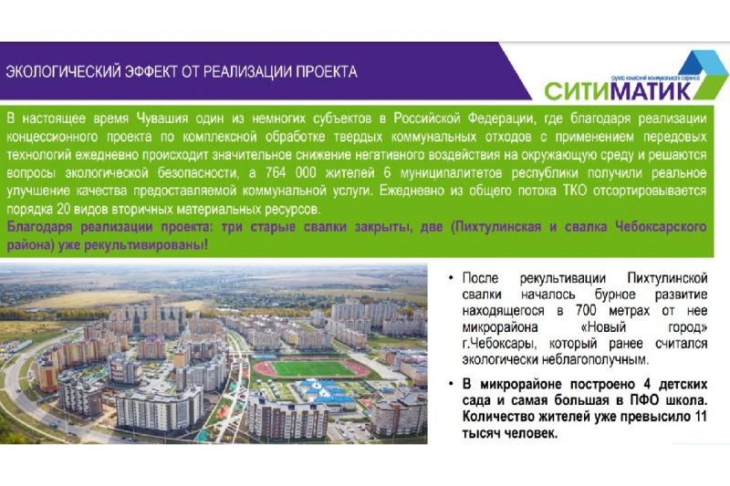 Концессионный проект, реализуемый АО «Ситиматик» в Чувашии, является ярким примером грамотного использования основных принципов ESG. Концессионер привлек инвестиции для создания современной высокотехнологичной инфраструктуры по обработке и захоронению твердых коммунальных отходов. Благодаря запуску двух мусоросортировочных заводов и второй карты полигона более половины жителей республики получили качественную коммунальную услугу, в рамках которой ежедневно из общего потока ТКО отсортировывается 20 видов вторсырья, а также было рекультивировано 2 больших свалки. Предприятие является объектом промышленного туризма и первым стало использовать ловчих служебных птиц для борьбы со стайными птицами.