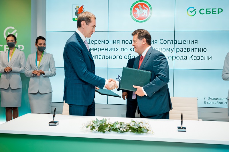 В рамках Восточного экономического форума первый заместитель Председателя Правления Сбербанка Александр Ведяхин и мэр Казани Ильсур Метшин подписали соглашение о намерениях по комплексному развитию города. В церемонии подписания принял участие Президент Татарстана Рустам Минниханов.