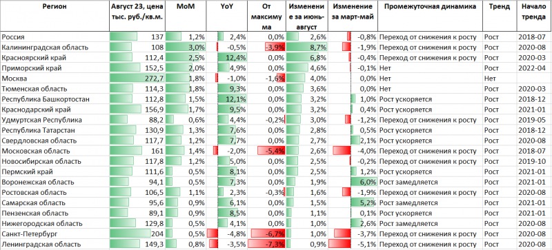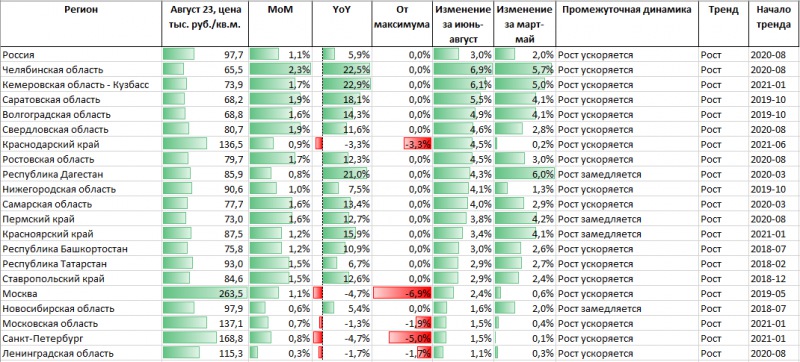 Из крупнейших по численности населения регионов сильнее всего выросли цены в Челябинской области до 65,5 тыс. руб. (+2,3% м/м), Саратовской области до 68,2 тыс. руб. (+1,9% м/м) и в Свердловской области до 80,7 тыс. руб. (+1,9% м/м). При этом в указанных регионах цены ежемесячно непрерывно растут уже более трех лет подряд.