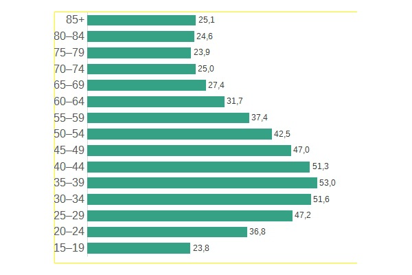 По мере взросления доходы планомерно растут и достигают пика — 53 тыс. рублей — в 35–39 лет. Чуть меньше — 52,3 и 51,6 тыс. — расходуют россияне 40–44 и 30–34 лет соответственно. Эксперты СберИндекса связывают такую статистику как с высокими затратами на обустройство жилья, детей и другие сферы жизни, так и с пиком доходов, который приходится на этот период жизни.
