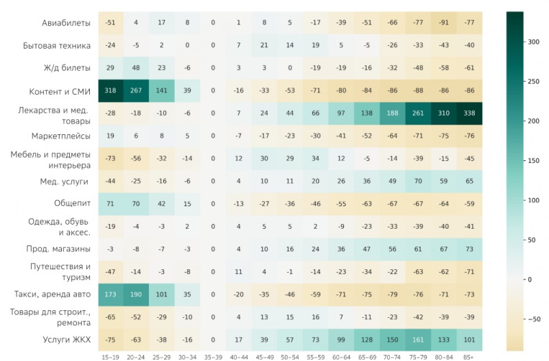 Эксперты также проанализировали долю расходов на различные категории товаров в бюджетах людей разных возрастов, сравнив их с референсной группой 35–39 лет. Так, оказалось, что в бюджете подростков в 4 раза больше доля расходов на контент и СМИ, и на 71% — на общепит. В бюджете 40–64-летних на 4–16% больше доля расходов на строительство и ремонт, а среди людей старше 65 лет более чем в 2 раза больше доля трат на здоровье и на 47% и более — расходов на продовольствие.