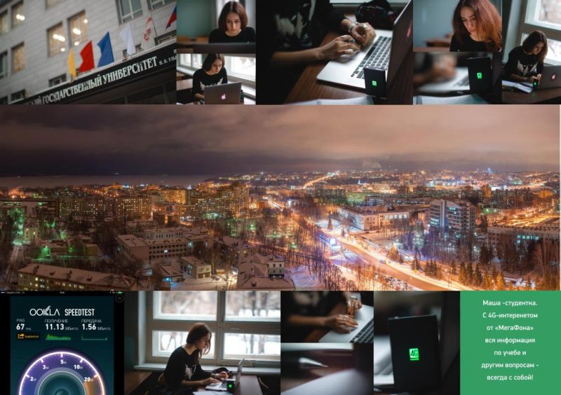 Например, панорама с бизнес-центром дополнена снимком молодого предпринимателя, который с помощью 4G-интернета удачно совмещает отдых и работу на бирже. На фото частного сектора – поклонник онлайн-игр, которому высокие скорости помогают выигрывать сражения. Молодая семья в клинике – дети в ожидании приема спокойно смотрят мультфильмы на планшете. А жизнь студента сама по себе очень насыщенна, и высокие скорости нужны в любой момент: для учебы, работы, отдыха, общения.