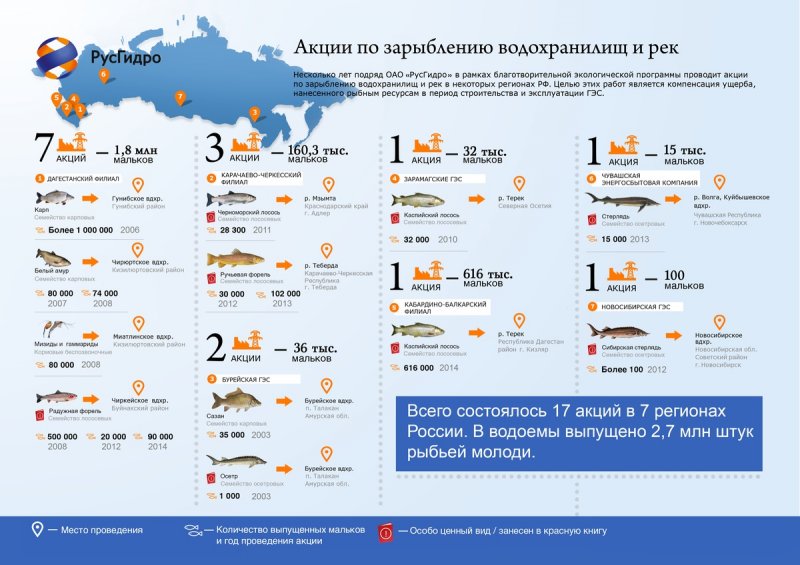В течение 2003 – 2014 гг. компания РусГидро провела 17 благотворительных экологических акций по зарыблению водохранилищ в семи регионах нашей страны. В результате в водоемы выпущено около 2,7 миллионов штук рыбьей молоди. Среди них есть виды особо ценных пород, занесенных в Красную книгу. Самые первые мероприятия по восполнению рыбных ресурсов были проведены в 2003 году на Дальнем Востоке. Тогда в водохранилище строящейся Бурейской ГЭС (Амурская область) было выпущено 36 тыс мальков осетра и сазана. В 2006 – 2014 годах Дагестанский филиал РусГидро осуществил масштабное зарыбление водохранилищ своих ГЭС: Гунибского, Чирюртского, Чиркейского, Миатлинского. В эти водоемы было заселено порядка 1,8 млн. мальков карпа, белого амура, радужной форели и кормовых безпозвочных (мизид и гаммарид). В 2010 – 2014 гг. гидроэнергетики Карачаево-Черкесии, Северной Осетии и Кабардино-Балкарии восполнили рыбные запасы рек Северного Кавказа и Краснодарского края 800 тысячами мальками черноморского и каспийского лосося, ручьевой форели. Новым обитателем водохранилища Новосибирской ГЭС стала сибирская стерлядь, 100 мальков рыбы этой редкой рыбы было заселено в 2012 году. В 2013 году Чувашская энергосбытовая компания (входит в энергосбытовой холдинг «РусГидро) выпустила 15 000 мальков стерляди в р. Волга (Куйбышевское водохранилище).