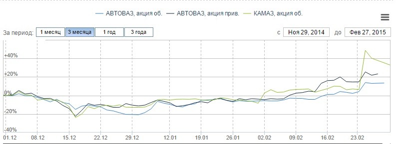 Пока же мы наблюдаем резкий рост котировок акций российских предприятий из так называемого второго эшелона. К примеру, вчера по состоянию на 11:50 мск рост акций концерна «Камаз» достиг 39,81% - достигнув стоимости в 44,60 руб. за акцию - на фоне новостей о его слиянии с немецким автомобилестроительным концерном Daimler. Как сообщил Александр Степанов, специалист сектора дилерских операций Инвестиционной компании «НФК-Сбережения», за последние два месяца значительный рост показали акции «Автоваз», «Соллерс», аптечной сети «36,6», Группы «Разгуляй», «Объединенные Машиностроительные заводы» (ОМЗ) и другие. К примеру, акции «Разгуляй» за период с 25 декабря выросли в цене на 225,58%, акции «36,6» только за один день 13 февраля выросли в цене на 56%, привилегированные акции ОМЗ выросли за период со 2 по 9 февраля на почти на 400%.
