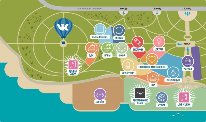Фестиваль ВКонтакте состоится 18 – 19 июля. На два летних дня Парк 300-летия Санкт-Петербурга превратится в оживший прототип ВКонтакте, где сообщества станут реальными клубами по интересам, аудиозаписи — любимыми исполнителями на сцене, а лайки — живыми эмоциями и улыбками. Пространство огромного парка будет поделено на площадки по интересам: «Музыка», «Инновации», «Юмор», «Еда», «Образование», «Экстрим», «Драйв», «Игры», «Спорт», «Мода и дизайн», «Маркет», «Благотворительность», «Дети». Музыкальная составляющая Фестиваля будет представлена тремя сценами, более чем 50 артистами и практически всеми стилями музыки.