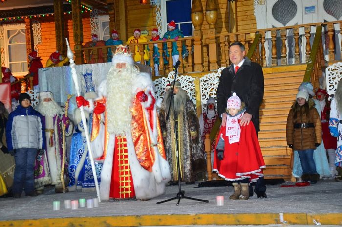 Мальчик из Поволжья зажег огни на первой новогодней елкеГубернатор Вологодской области Олег Кувшинников, Дед Мороз и победитель творческого конкурса благотворительного проекта МТС «Поколение М» Валера Озеров зажгли огни на первой в стране новогодней ёлке в Вотчине Российского Деда Мороза в Великом Устюге.