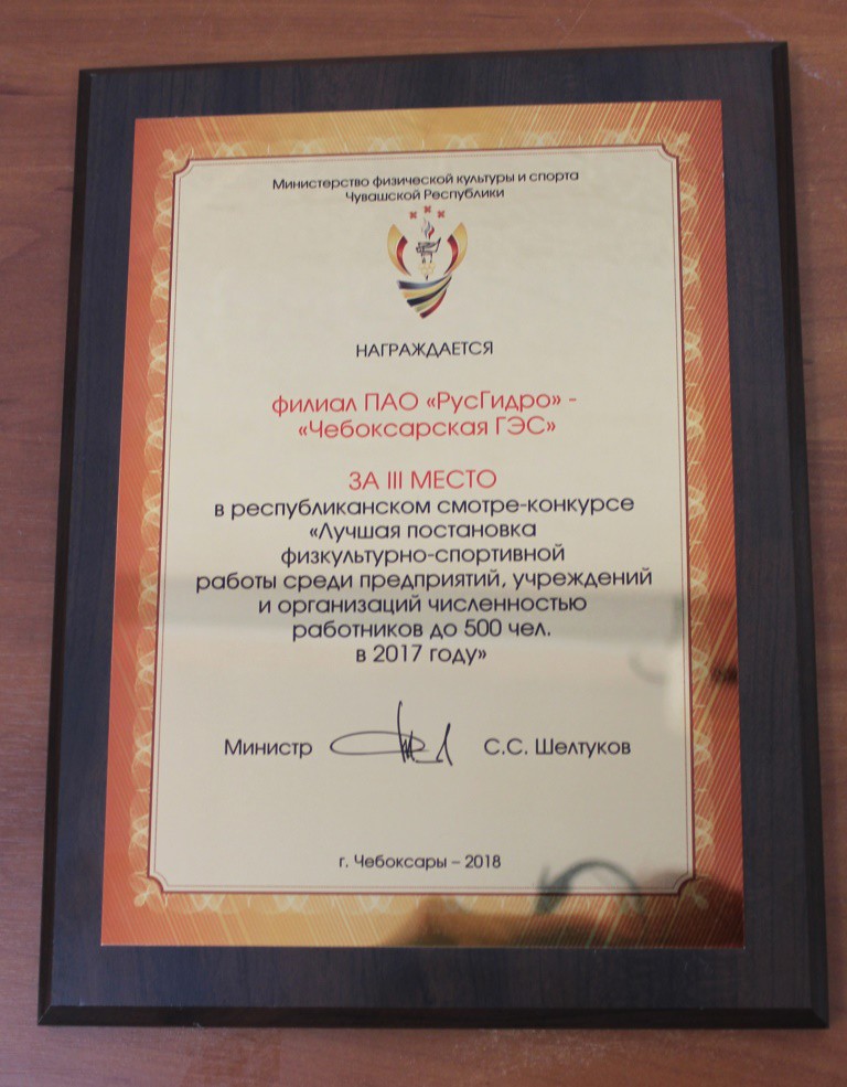 Чебоксарская ГЭС - призер Республиканского спортивного смотра-конкурса На расширенном заседании коллегии Минспорта Чувашии Сергей Шелтуков, министр физической культуры и спорта Республики, вручил директору Чебоксарской ГЭС Вадиму Бардюкову диплом за третье место в республиканском смотре-конкурсе «Лучшая постановка физкультурно-спортивной работы среди организаций в 2017 году».