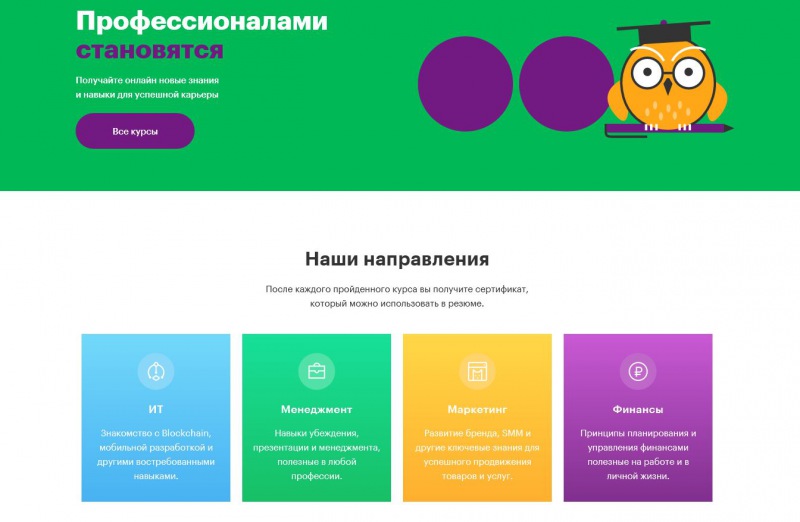 С помощью нового онлайн-сервиса легко получать знания из обучающих курсов по таким популярным направлениям, как ИТ, маркетинг, менеджмент и финансы. На платформе доступны изучение языков программирования и офисных инструментов (Excel, Word, PowerPoint), основы работы с базами данных, знакомство с навыками публичных выступлений, тайм-менеджмента и другие дисциплины.