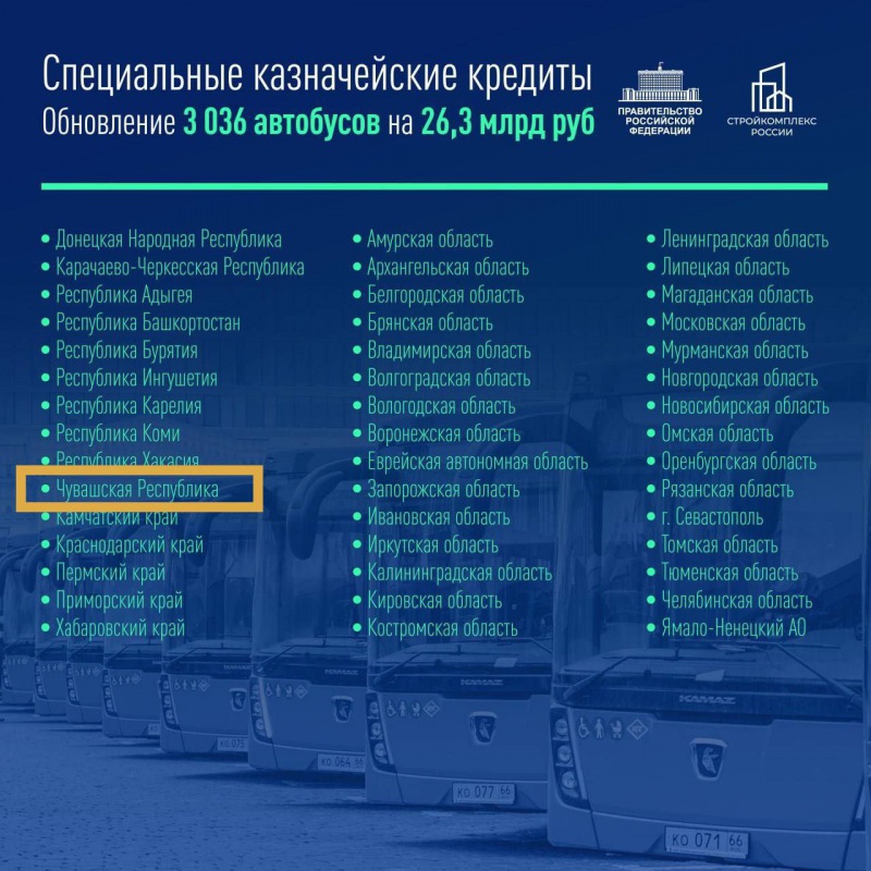 "Заявка Чувашской Республики получила положительное заключение от заинтересованных федеральных исполнительных органов. Региону одобрено предложение по выделению специальных казначейских кредитов в размере 499,2 млн рублей на обновление парка автобусов. В планах на выделенные средства закупить 47 автобусов: среди которых 20 - большого класса, 17 - среднего и 10 - малого. Это позволит повысить безопасность, качество и комфорт поездок для пассажиров. Закупка подвижного состава начнется сразу, как только кредит будет доведен", - сообщил министр транспорта и дорожного хозяйства Чувашии Владимир Осипов.
