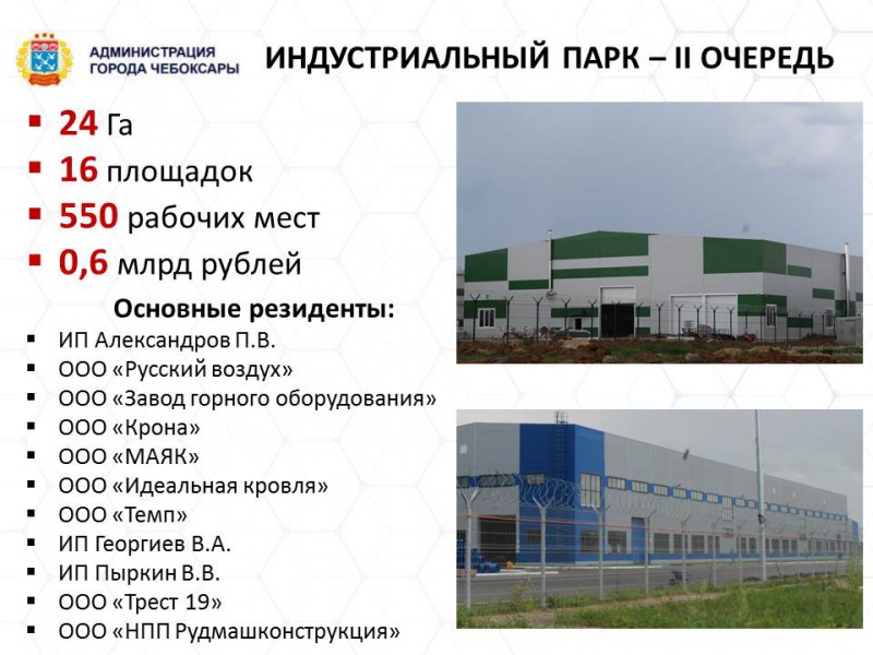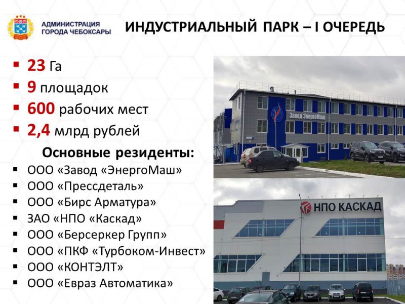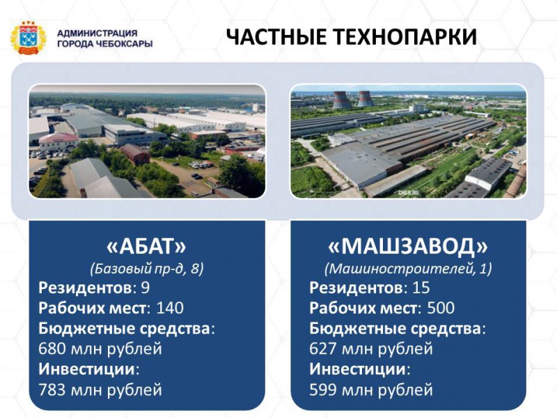 По информации заместителя главы администрации по экономическому развитию и финансам Инны Антоновой на территории города Чебоксары действуют два индустриальных парка по проспекту Тракторостроителей. Стоимость инженерной инфраструктуры обоих парков составила 460 млн рублей, подготовлено 26 земельных участков для размещения резидентов.