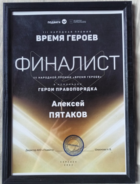 Победив в региональном этапе фестиваля, в качестве финалиста, полицейский принял участие церемонии награждения победителей народной премии, которая прошла в столице Мордовии. Алексею Пятакову был вручен диплом и приз фестиваля.