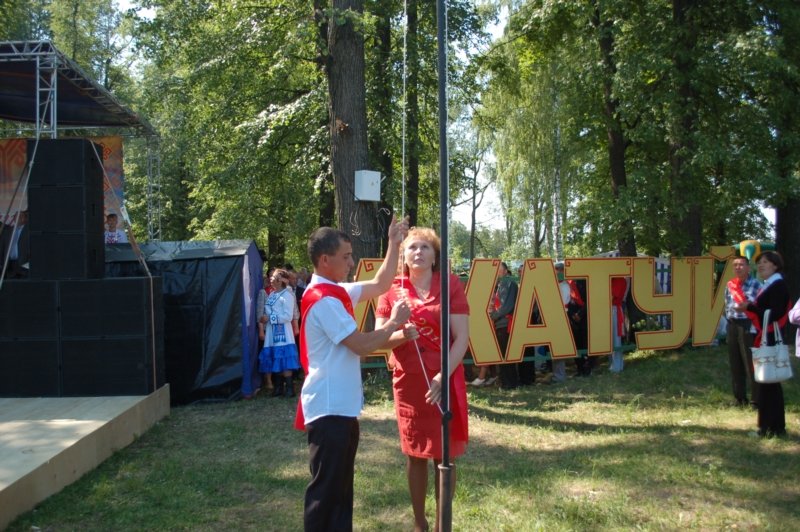 Торжественную часть праздника открыли с поднятия флага Акатуя. Это почетное право было предоставлено Алине Языковой, заведующей Буртасинским ветеринарным участком, и Владимиру Трофимову, газоэлектросварщику ОАО «Вурнарский мясокомбинат».