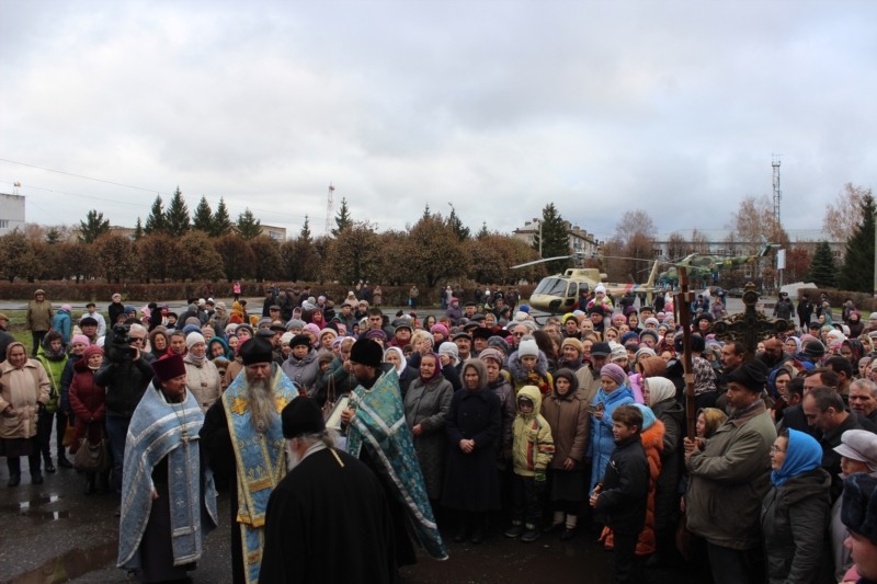 Первым городом, который принимал воздушный Крестный ход, стал Канаш. Приземлился вертолет на Центральной площади рядом с храмом-часовней святых Петра и Февронии. К этому время завершились Божественные литургии в храмах святителя Николая и "Всех скорбящих Радость" и прихожане направились в сторону площади.