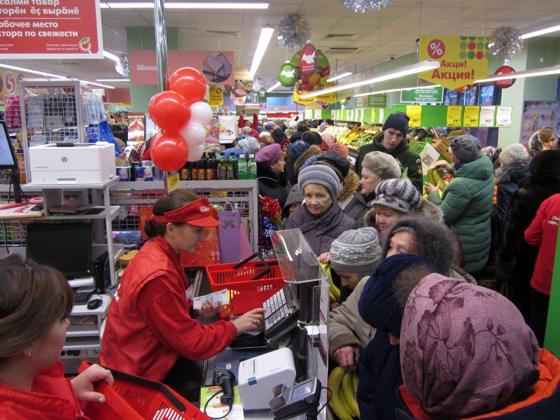 Благодаря хорошо подготовленному персоналу, состоящему из 12 человек (все местные жители) и просторному помещению с торговой площадью более 330 кв.м. по магазину можно было комфортно передвигаться и выбирать товары из более чем 4200 наименований. Ажиотаж вызвали акционные товары: в честь открытия универсама на них были установлены небывало низкие цены. В основном, это товары из категории «фрэш» - фрукты, овощи, мясо и т.п. Такие предложения никого не смогли оставить равнодушным, тем более в преддверии новогодних праздников.
