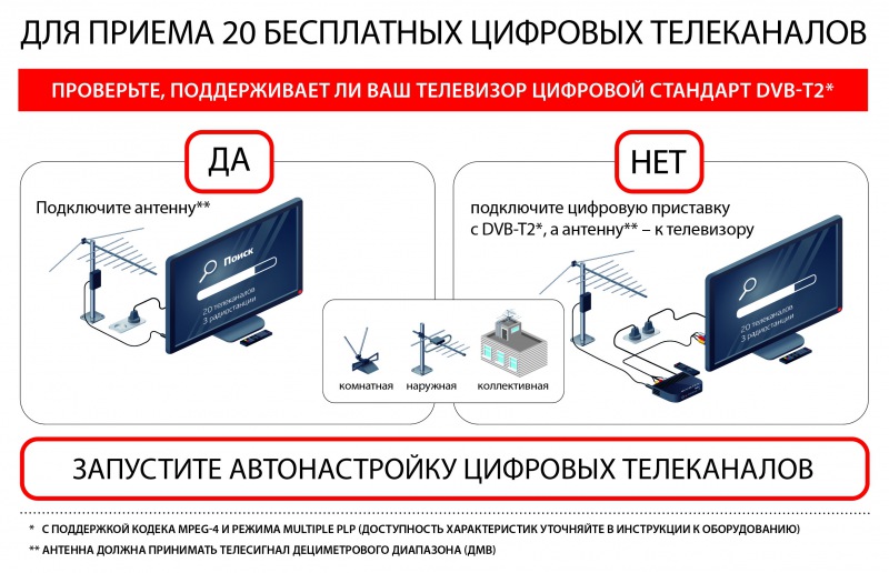 Подключение приёмного оборудования не занимает много времени и не требует специальных навыков и знаний. Большинство современных телевизоров полностью готовы к приему цифровых эфирных телеканалов. К ним нужно лишь присоединить комнатную или наружную антенну дециметрового диапазона. Если телевизор старый, то в дополнение к нему понадобится и цифровая приставка, и дециметровая антенна.