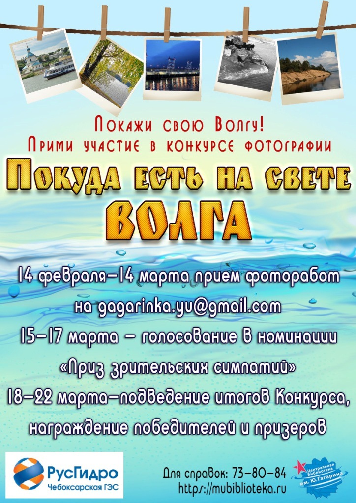 В честь Всемирного дня водных ресурсов, который ежегодно отмечают 22 марта, Чебоксарская ГЭС (филиал ПАО «РусГидро») совместно с Центральной библиотекой имени Ю. Гагарина приглашают всех желающих принять участие в фотоконкурсе «Покуда есть на свете Волга».