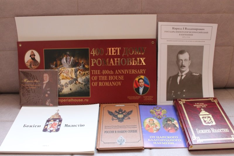 Среди подаренных книг также издание, посвященное царю Михаилу Федоровичу Романову, «От царского благородного пламени…» Кирилл Немирович-Данченко (2007), мемориальный сборник «Кирилл I Владимирович. Государь Император Всероссийский в изгнании 1876-1938»: (к 130-летию со дня рождения), воспоминания Великого Князя Владимира Кирилловича и Великой Княгини Леониды Георгиевны «Россия в нашем сердце» (1995), диск «Не угасла свеча» к 20-ой годовщине со дня упокоения Государя Великого Князя Владимира Кирилловича. На диске записаны два фильма: «Возвращение Великого Князя» о Государе Владимире Кирилловиче и «Император в изгнании» о Его Августейшем Отце, Императоре Кирилле I Владимировиче.