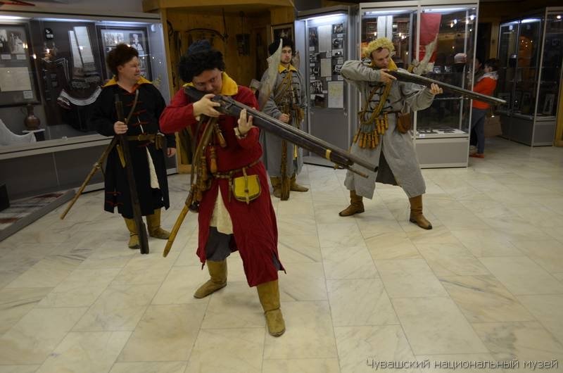 На станциях «ОтЧАЙные рассказы», «SMS из прошлого», «Затерявшиеся буквы», «Все дело в шляпе» посетители узнали много интереснейших фактов из прошлого. А всех собравшихся на первом этаже впечатлила выставка оружия «Рати сверкающая сталь». Выставку удачно подчеркнуло яркое выступление стрельцов военно-исторического клуба «Русский егерь». Бравые стрельцы-молодцы с бердышами наперевес собрались вокруг походного шатра, сооруженного посреди зала музея, и показали приемы строевой подготовки с холодным оружием.