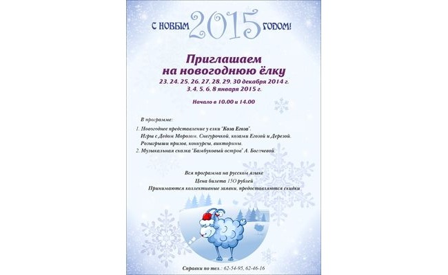 Добро пожаловать на новогоднее представление у елки «Коза Егоза» и музыкальную сказку «Бамбуковый остров» на русском языке. Чувашский государственный академический драматический театр ждет маленьких и взрослых зрителей 23, 24, 25, 26, 27, 28, 29, 30 декабря 2014 года, 3, 4, 5, 6, 8 января 2015 года.