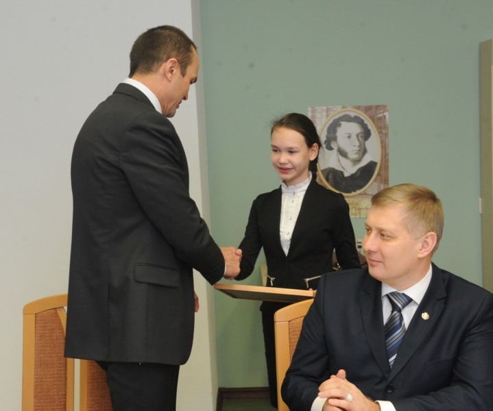 Михаил Игнатьев вручил часы с изображением Герба Чувашской Республики молодым дарованиям школы №24 г. Чебоксары Виктории Ласточкиной и Анастасии Сиговой, продекламировавшим стихи собственного сочинения.