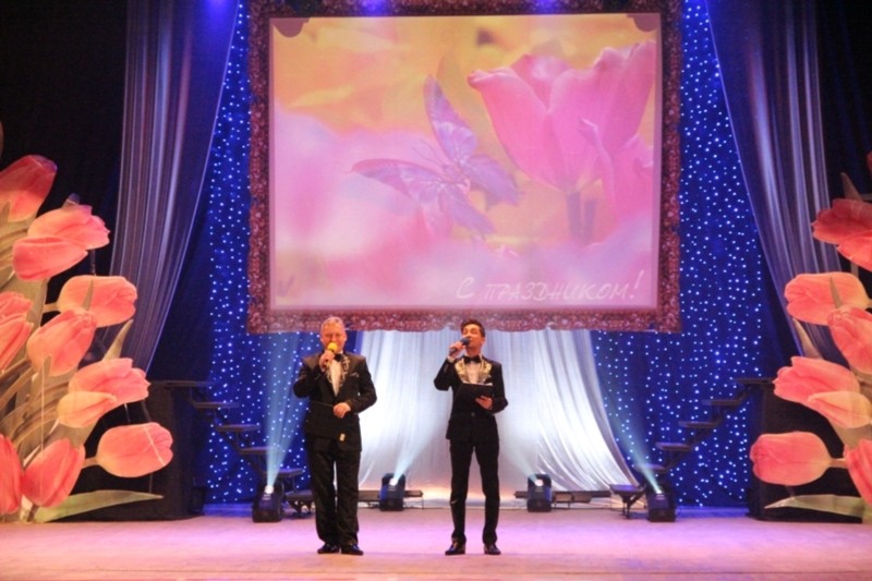 Сцену, оформленную для этого праздника, украшали огромный букет тюльпанов, драпировка воздушных тканей, мерцающий свет плэйлайта.