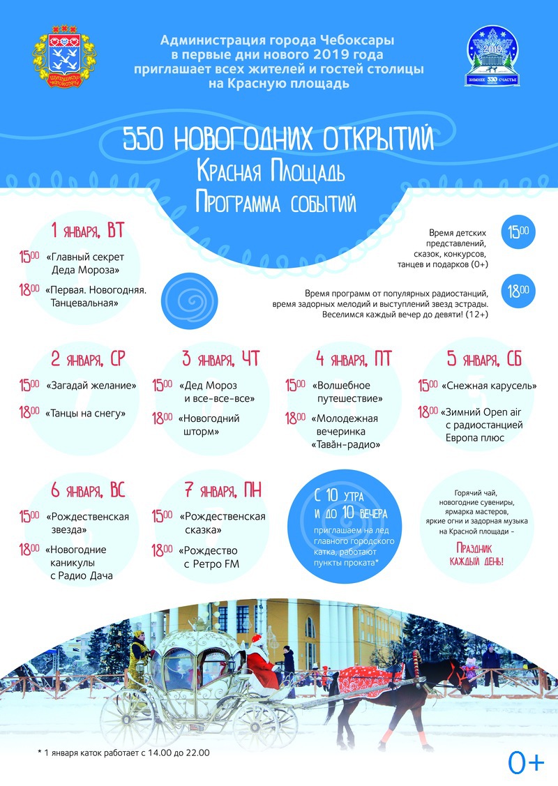 Администрация города Чебоксары в первые дни Нового 2019 года приглашает всех жителей и гостей столицы на Красную площадь. Здесь с 1 по 7 января вас ждут 550 новогодних открытий!