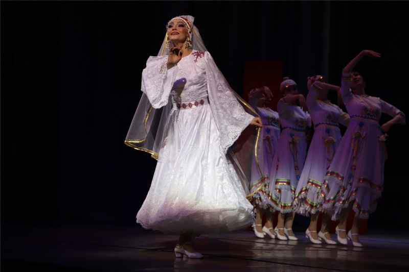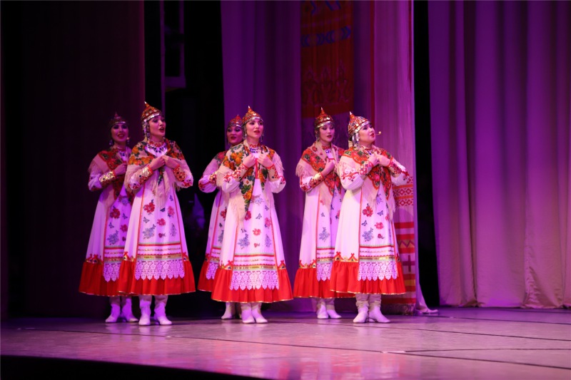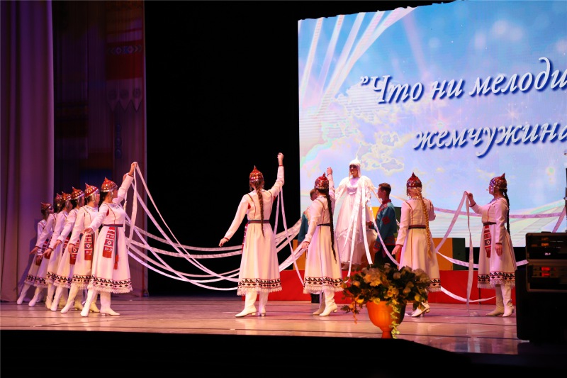 Концертная программа началась с театрализованного представления "К?м?л çип" (Серебряная нить), в котором отразились наиболее значимые и яркие события творческого пути ансамбля, напоминающее о его создателях и артистах.